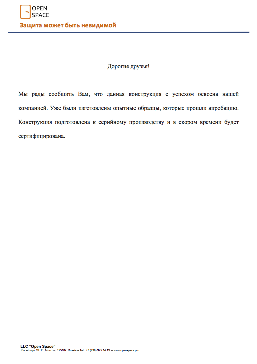 Конструкция испытана по ГОСТ 30247.0-94 «Конструкции строительные. Методы испытаний на огнестойкость. Общие требования» и ГОСТ Р 53308-2009 «Конструкции строительные. Светопрозрачные ограждающие конструкции и заполнения проемов. Метод испытаний на огнестойкость» и сертифицирована с целью подтверждения соответствия ее характеристик требованиям Федерального закона №123-ФЗ от 22.07.2008 «Технический регламент о требованиях пожарной безопасности».